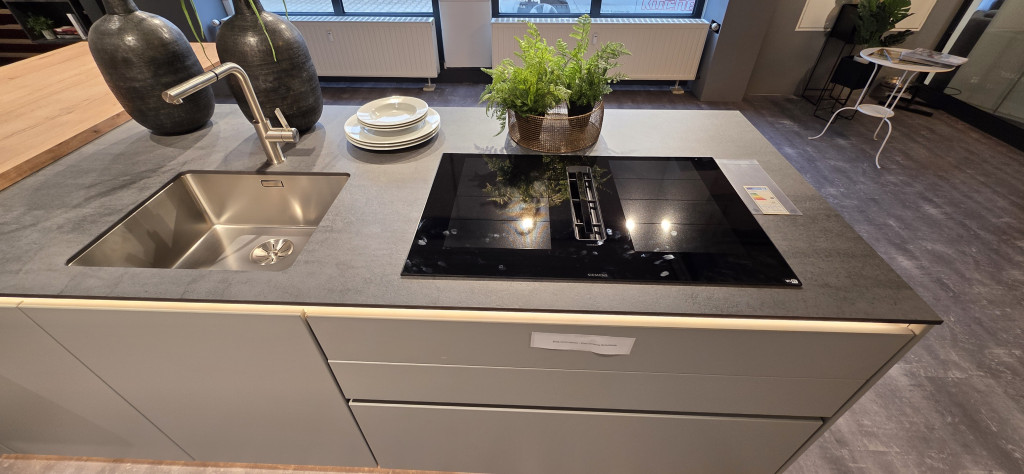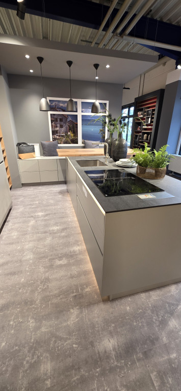 Entdecken Sie unsere exklusive Abverkaufsküche mit matten Fronten, die nicht nur modern und stilvoll sind, sondern auch eine angenehme Haptik bieten. Die Küche ist mit einem hochmodernen Muldenlüfter ausgestattet, der nicht nur für eine effektive Luftreinigung sorgt, sondern auch das elegante Erscheinungsbild der Küche unterstreicht. Dank der Verwendung robuster und pflegeleichter Materialien ist diese Küche langlebig und einfach zu reinigen. Die hochwertigen Siemens Elektrogeräte garantieren erstklassige Leistung und Zuverlässigkeit bei jedem Kochvorgang.